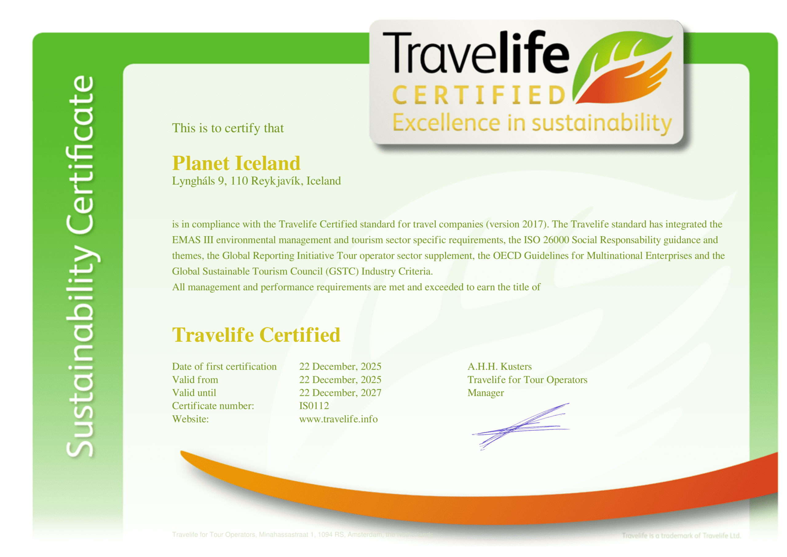 At Planet Iceland, sustainability is an integral part of how we operate and how we design travel experiences. We remain steadfast in our commitment to fostering sustainable growth in our business operations. Recognising the profound importance of the environment, communities, and cultures that surround us, we acknowledge that their well-being is integral to the success of our enterprise. Achieving Travelife Certified confirms our long-term commitment to continuous improvement and to offering travel experiences that respect nature, people, and place.